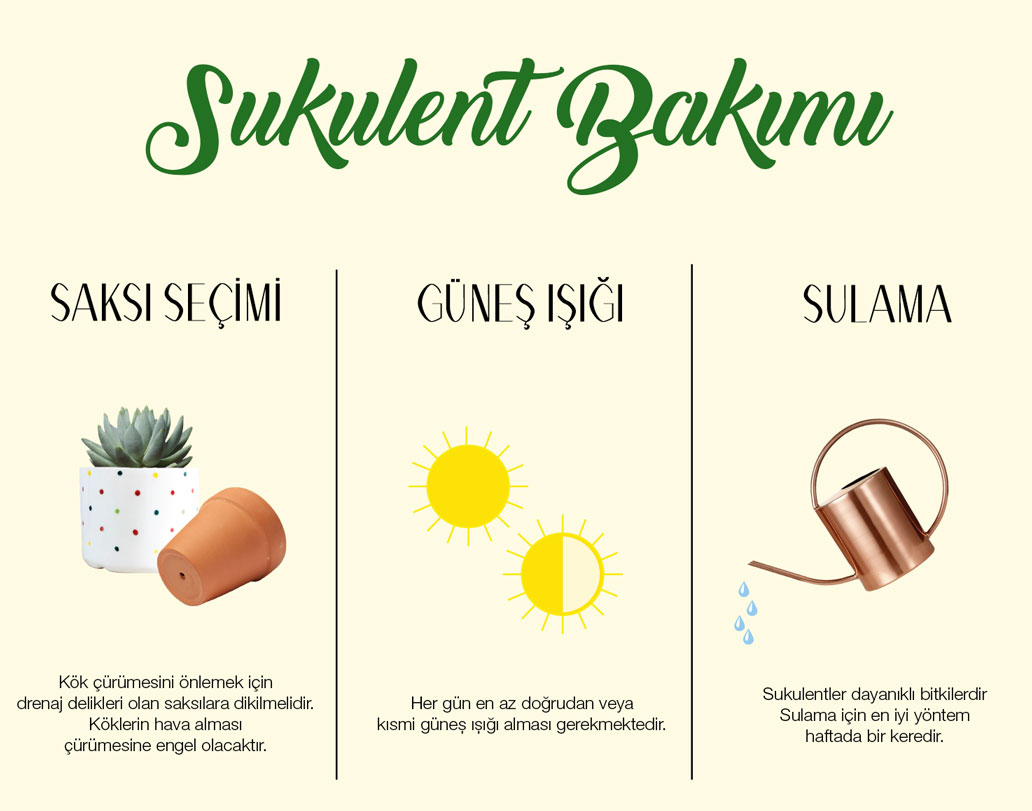 Sukulent bakımı bitkinin yetiştiği toprağa göre değişim gösterebilir ancak dikkat edilmesi gereken en önemli nokta, çok ya da az sulamamak. Çok sulanan sukulent yapraklarında buruşma göründüğü gibi az sulanan sukulent yapraklarında ise kahverengi lekelenmelere rastlanabiliyor. Bitki, su geçiren bir toprak cinsinde besleniyorsa o zaman iyice sulayıp saksıdan suyun akması ve toprağın nemli kalması sağlanabilir ancak aksi bir türde besleniyorsa o zaman sprey şişelerinde fısfıs sulama işlemi gerçekleştirilerek sukulent yapraklarındaki beyaz ve pembeleşmeye tanıklık ederek sağlıklı bir bakım sürecine girdiğinizi gözlemleyebilirsiniz. Çünkü normal şartlarda büyüyen bir sukulent, yapraklarında beyaz ve pembe lekelere yer verir.